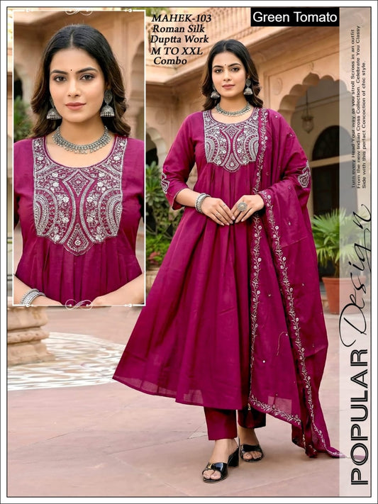 Mahek Green Tomato Roman Silk Readymade Anarkali Suits Wholesaler Gujarat