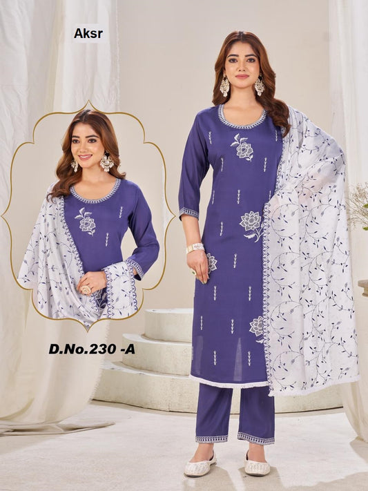 Design 230 Abc Aksr Roman Silk Readymade Pant Style Suits Manufacturer India