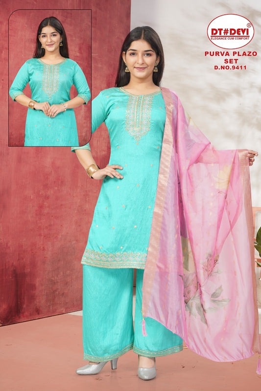 Purva Dn 9411 Dt Devi Vichitra Silk Girls Readymade Palazzo Suits Supplier India