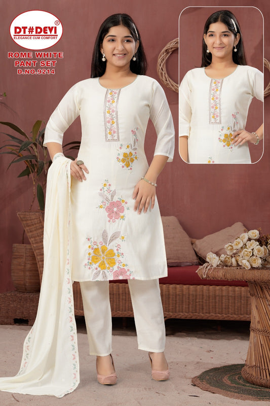 Rome White Dn 9214 Dt Devi Roman Silk Girls Readymade Pant Suits Wholesaler Gujarat