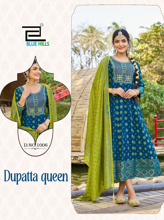 Queen Blue Hills Rayon 14Kg Gown Dupatta Set Supplier