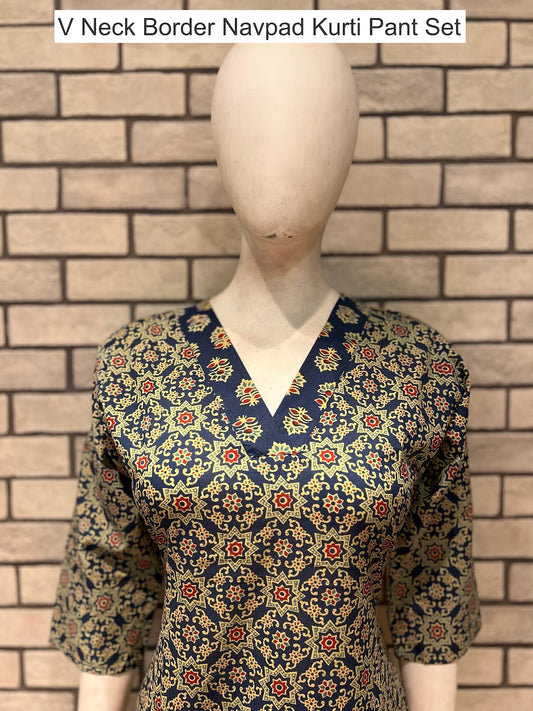 V Neck Border Navpad Cotton Kurti Pant Set Manufacturer Gujarat