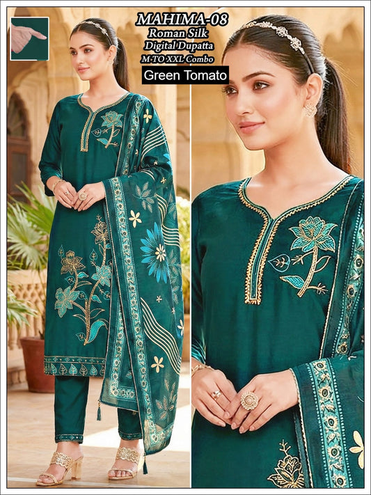 Mahima Green Tomato Roman Silk Readymade Pant Style Suits Exporter Gujarat