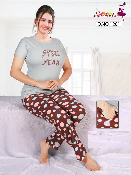 Plain-Print Design 1201 Priyanshi Saheli Sinker Pyjama Night Suits Wholesale Price