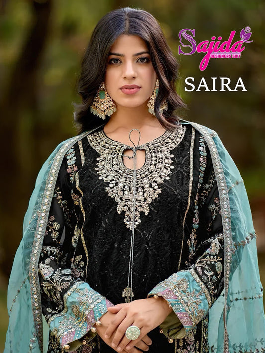 सायरा 1044 काले और सफेद साजिदा ऑर्गेंजा पाकिस्तानी सलवार सूट थोक विक्रेता भारत