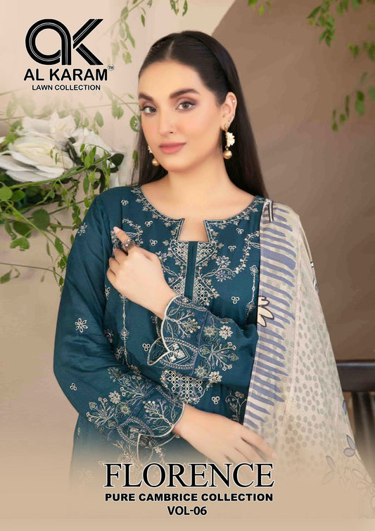 फ्लोरेंस वॉल्यूम 6 शुद्ध कैम्ब्रिक संग्रह अल करम कराची सलवार सूट थोक दर