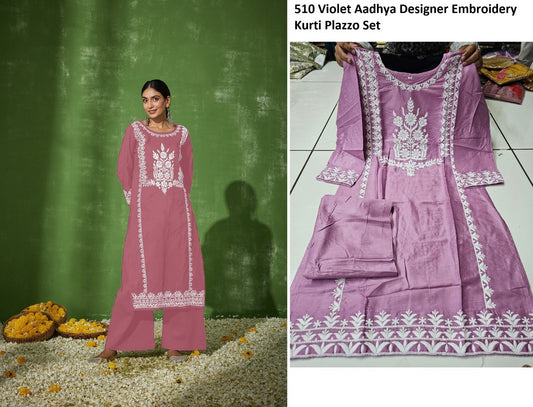510 आध्या डिज़ाइनर रेयॉन कॉटन कुर्ती प्लाज़ो सेट थोक रेट
