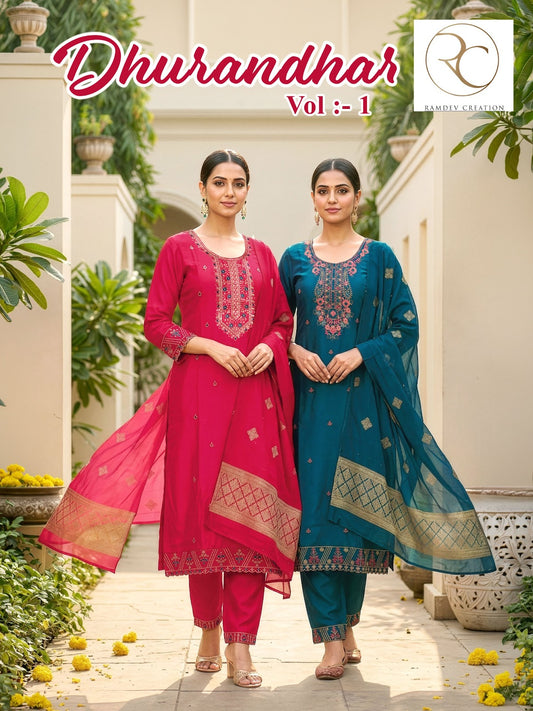 Dhurandhar Vol 1 Ramdev Creation Roman Readymade Pant Style Suits Exporter