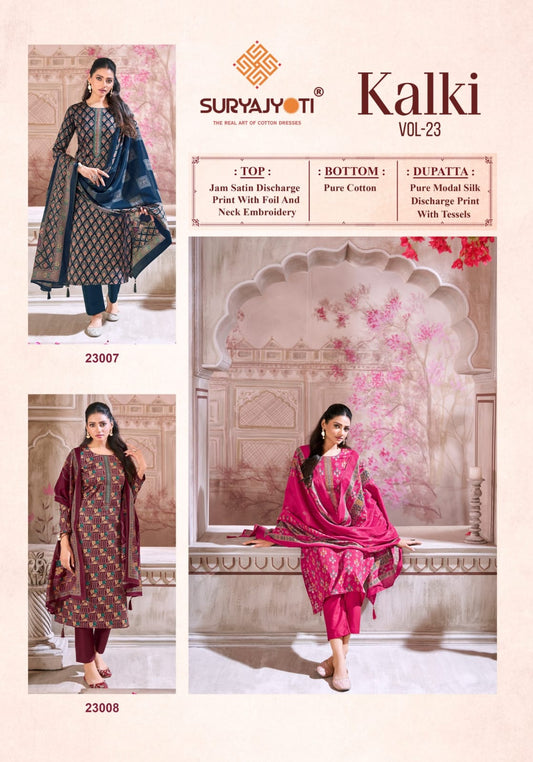 कल्कि वॉल्यूम 23 सूर्यज्योति जाम सैटिन पैंट स्टाइल सूट निर्यातक गुजरात