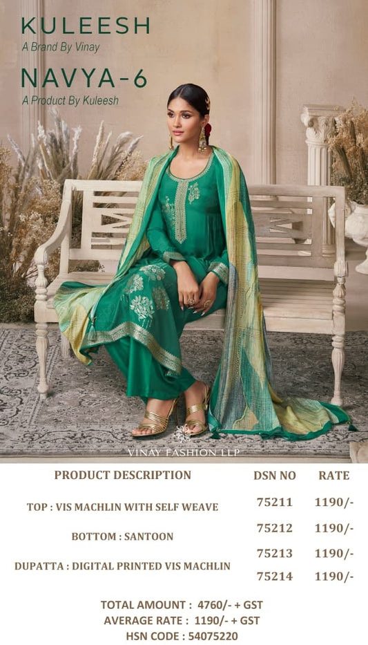 नव्या 6 कुलीश विनय फैशन एलएलपी मलमल जैक्वार्ड पैंट स्टाइल सूट थोक विक्रेता अहमदाबाद