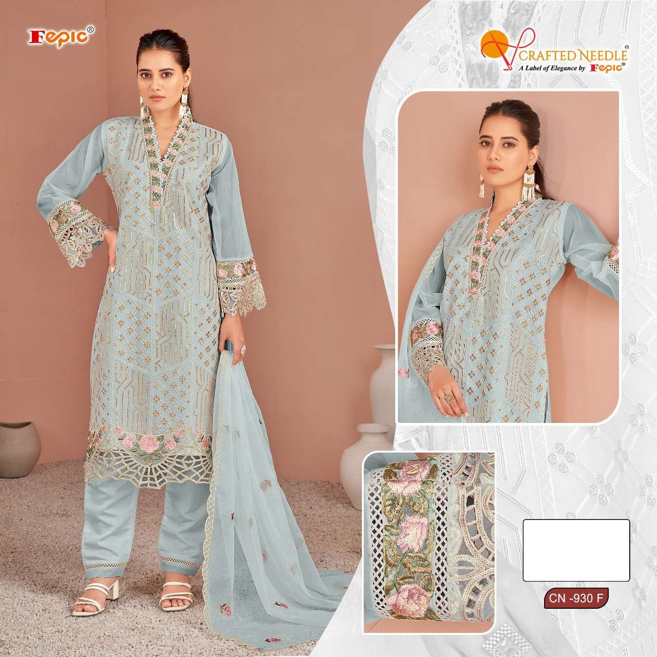 क्राफ्टेड नीडल सीएन 930 बीडीईएफ फेपिक ऑर्गेंजा पाकिस्तानी रेडीमेड सूट निर्माता अहमदाबाद