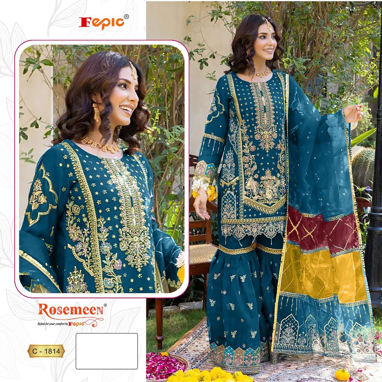 रोज़मीन सी 1814 फेपिक ऑर्गेंजा पाकिस्तानी सलवार सूट निर्यातक गुजरात