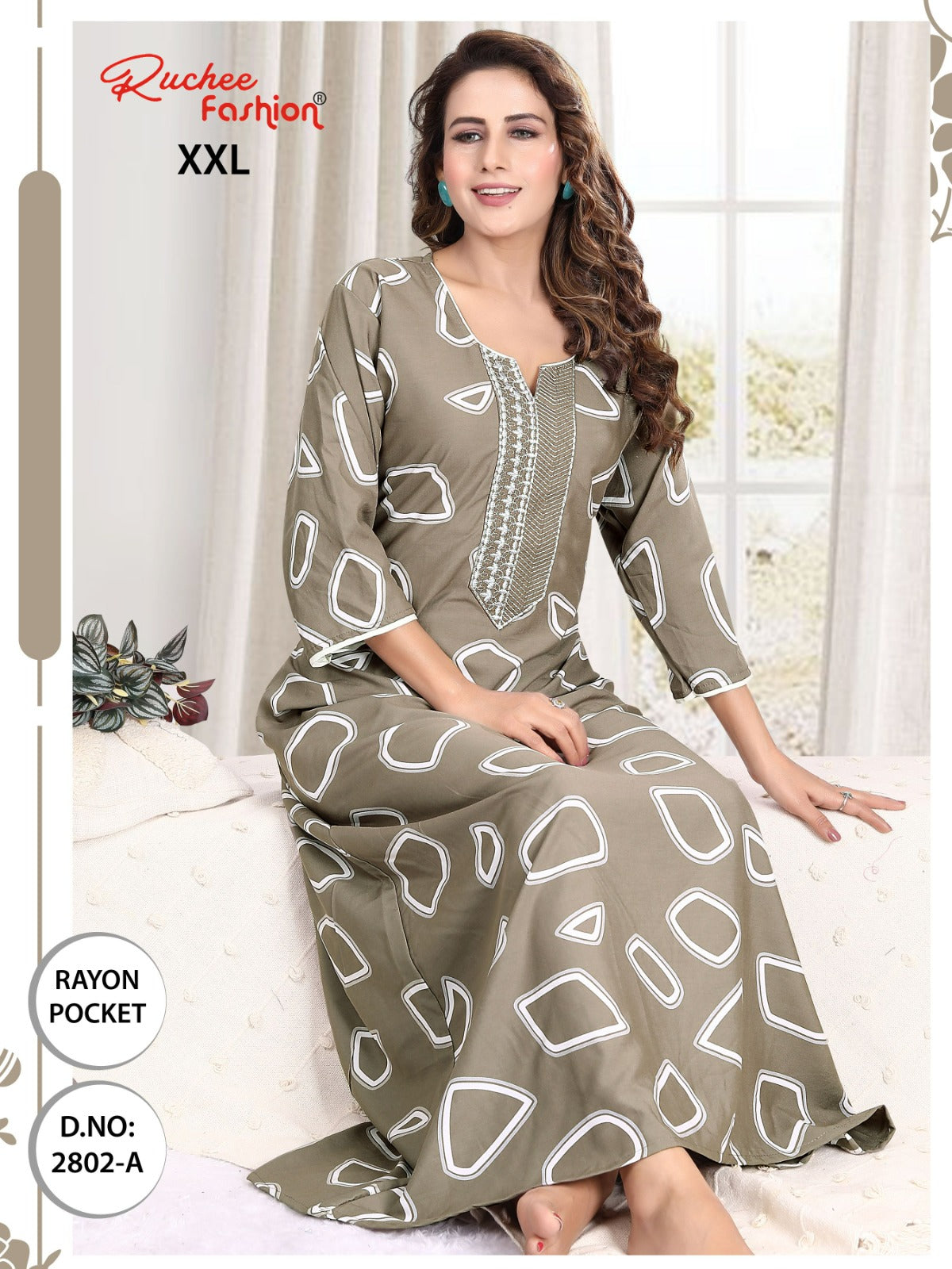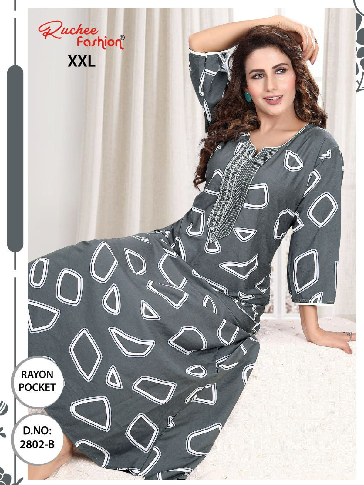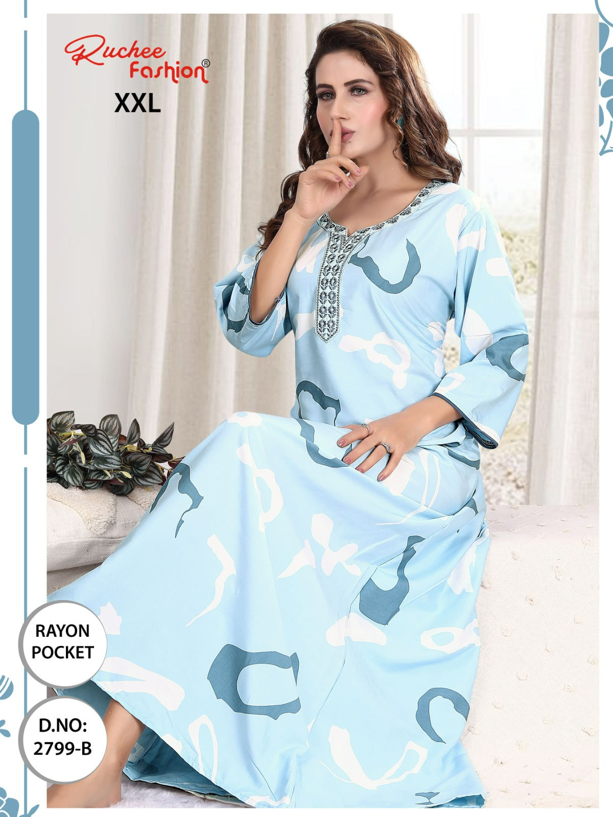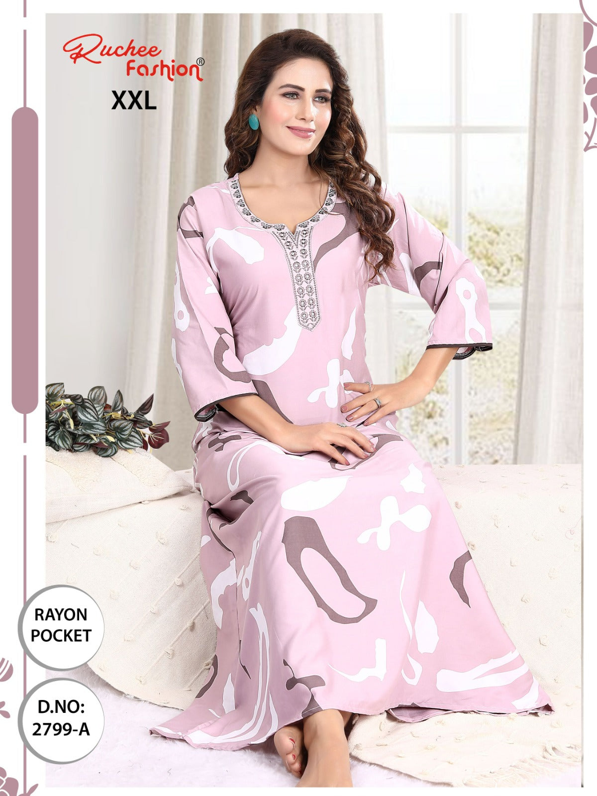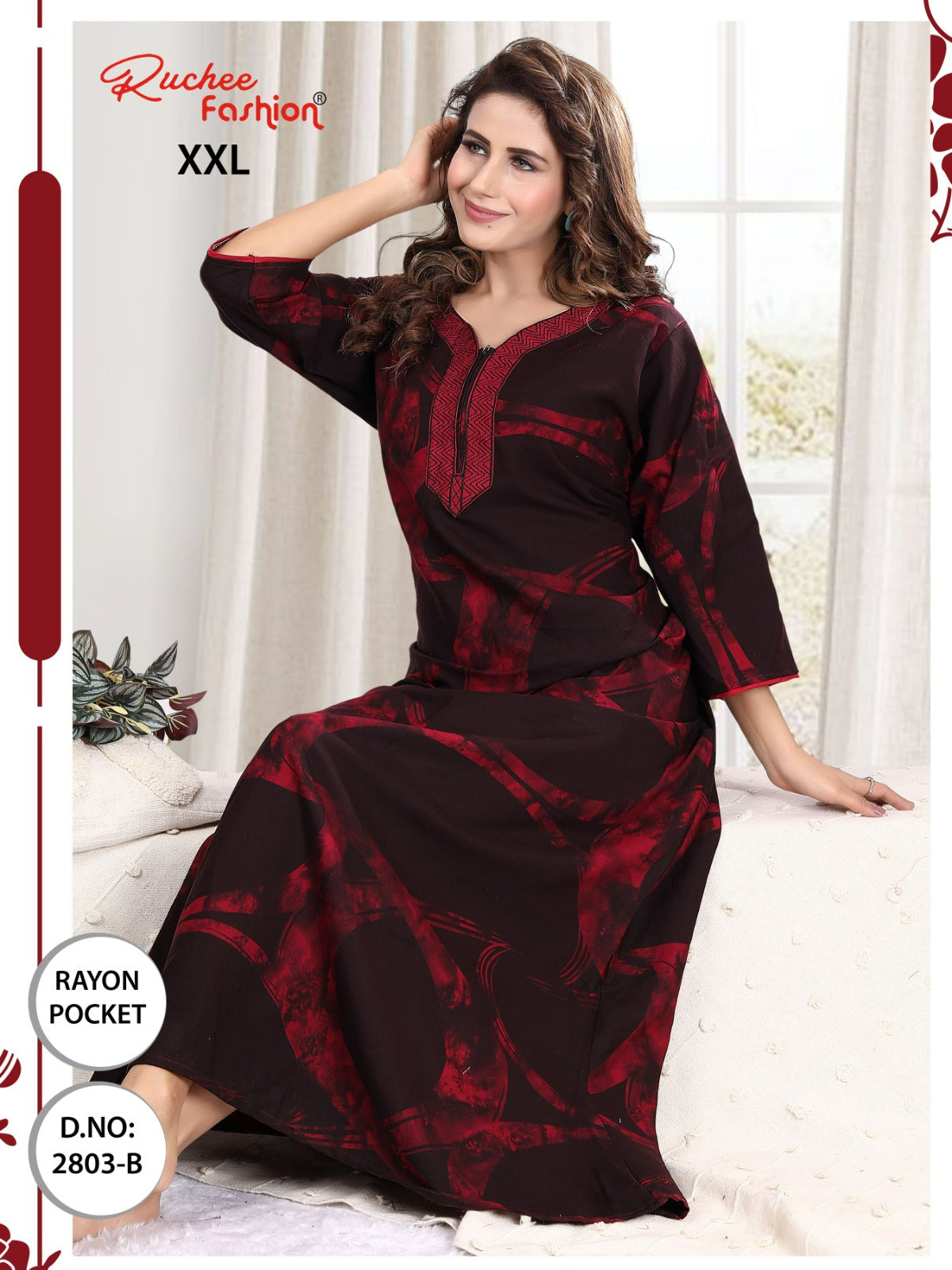 - फ़ैब्रिक विवरण: रेयॉन पॉकेट और कढ़ाई वाली नाइटी 3/4 स्लीव के साथ लंबाई - लगभग 58