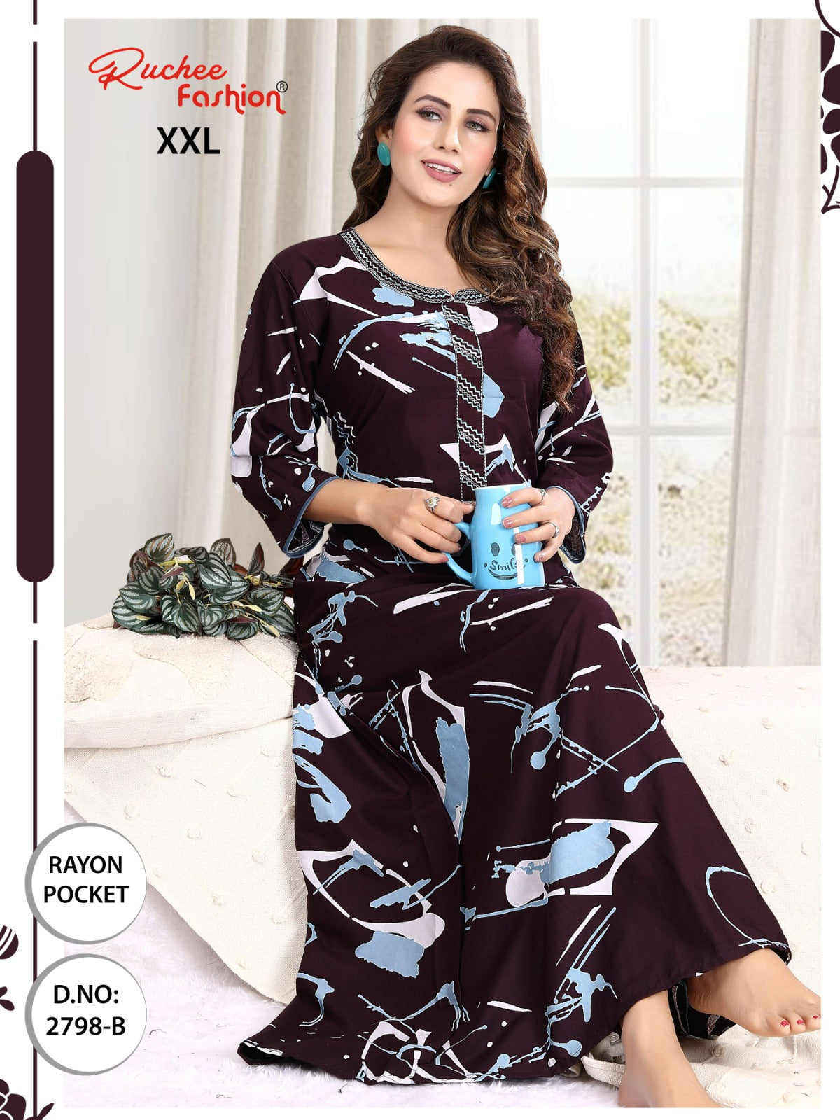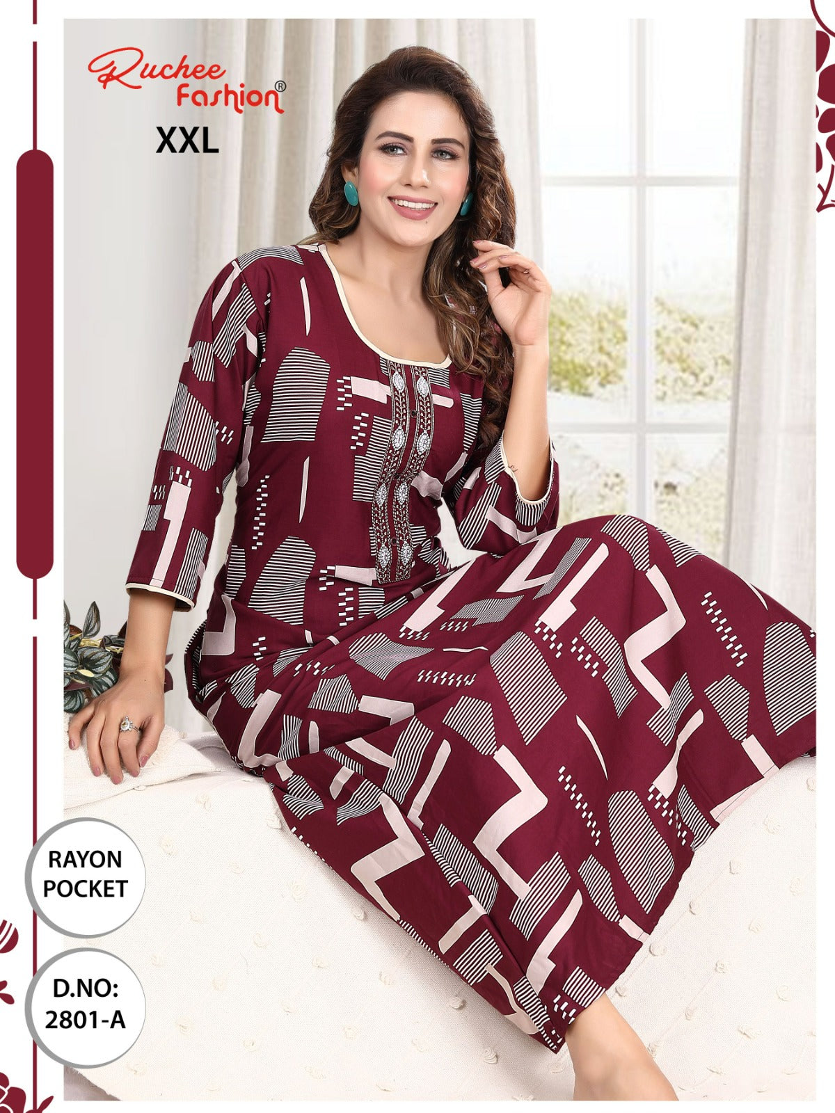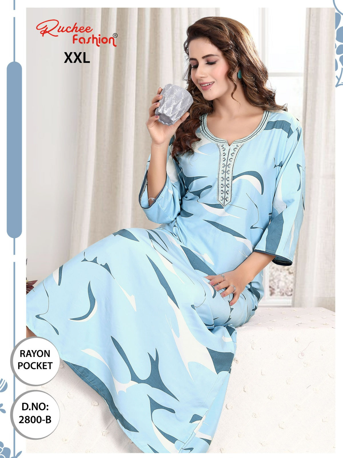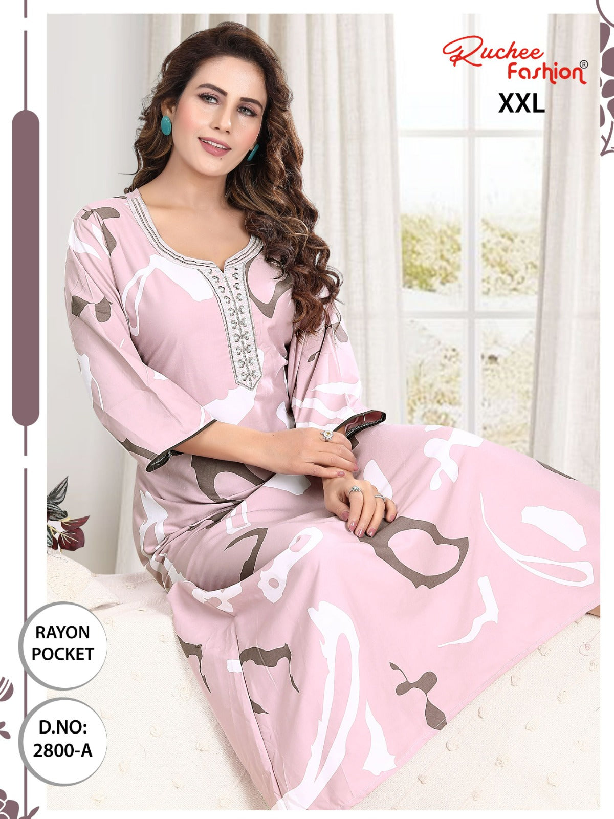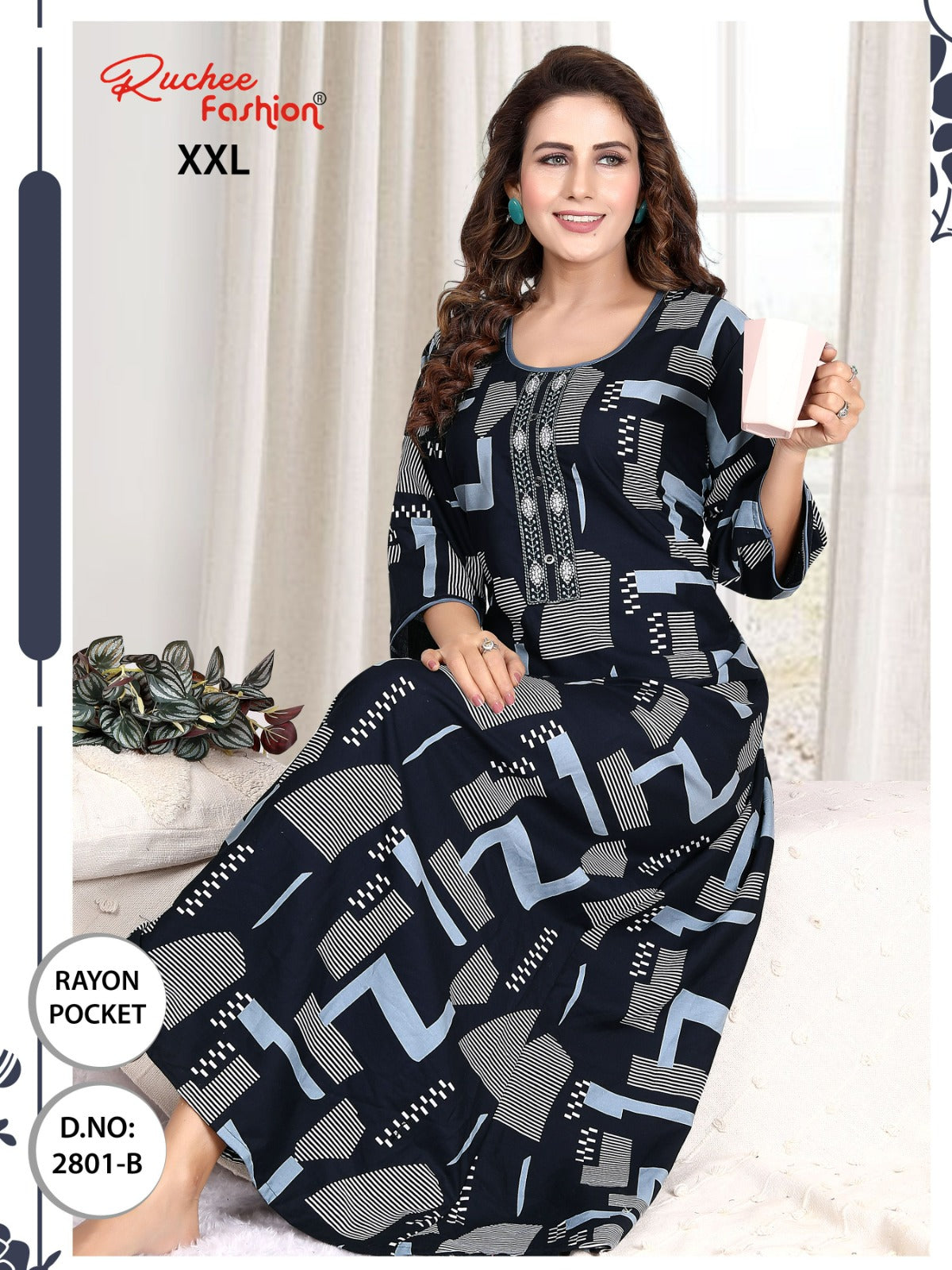 - फ़ैब्रिक विवरण: रेयॉन पॉकेट और कढ़ाई वाली नाइटी 3/4 स्लीव के साथ लंबाई - लगभग 58