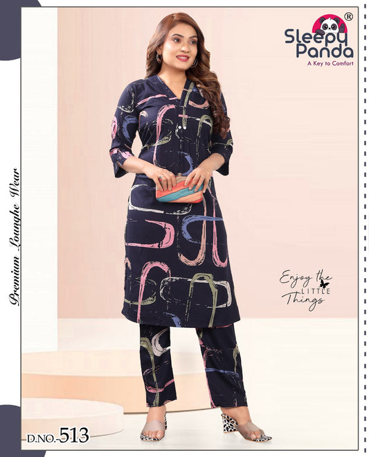 Design 513 Sleepy Panda Rayon 22Kg Kurti Pant Set Wholesale